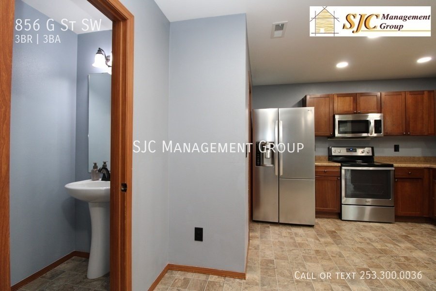 Three-bedroom home in Tumwater for rent. Features open living area, stainless appliances, no carpet-LVP and vinyl flooring throughout, and a fully fenced backyard. Home includes living room, kitchen, laundry room, three bedrooms, and two and a half bathrooms. Schedule a showing or take our virtual tour today!
